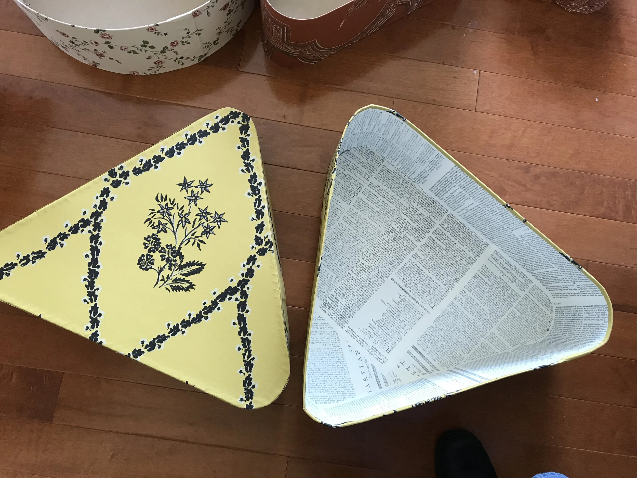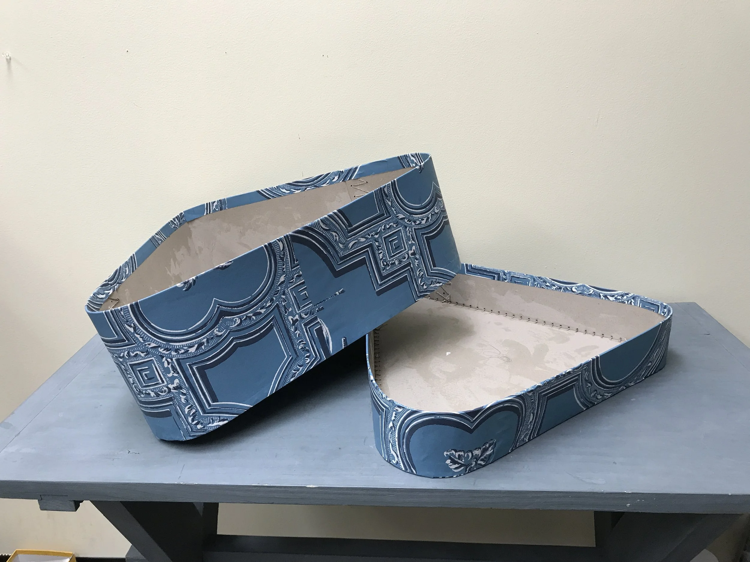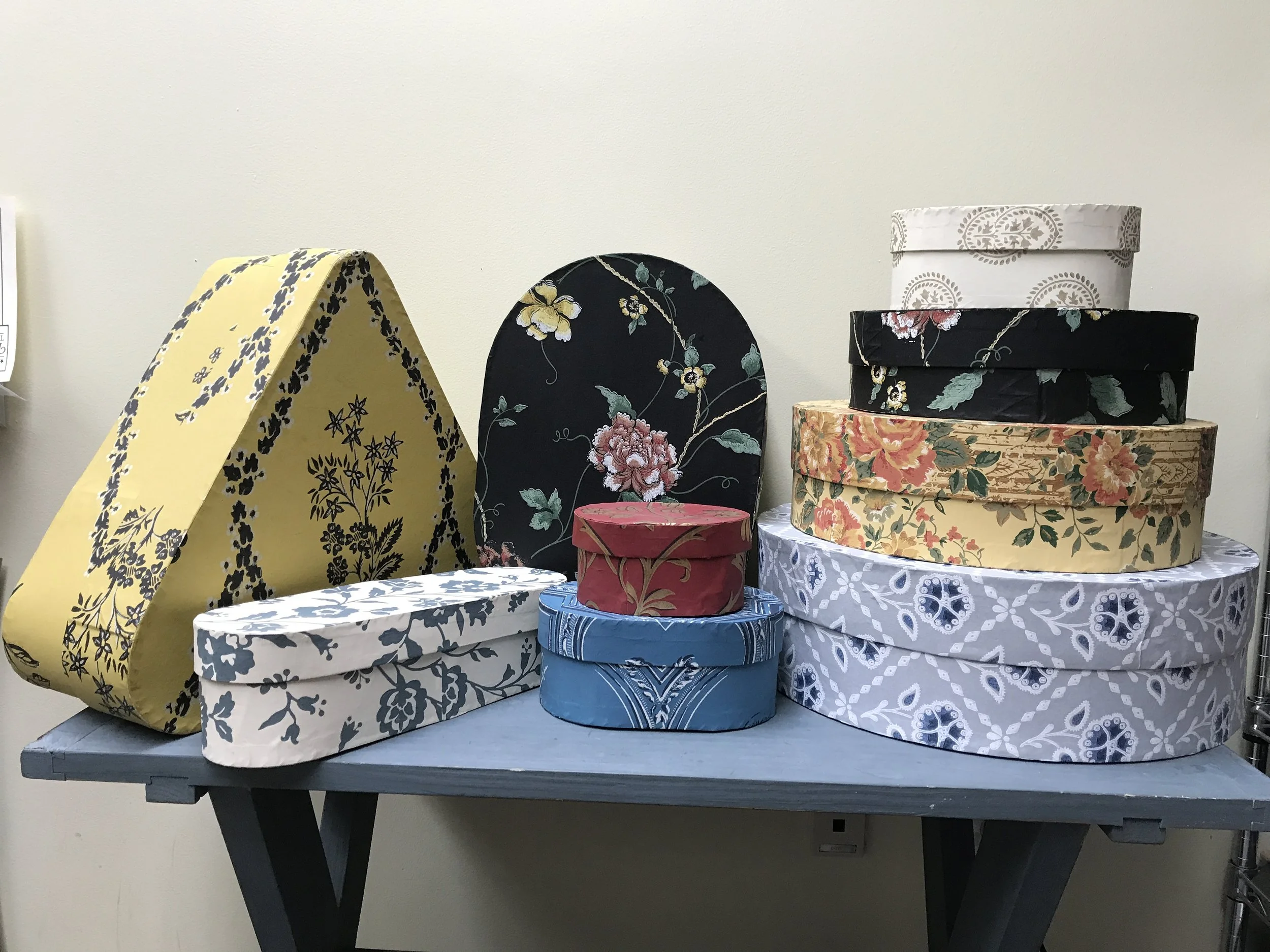 Normally the bandboxes I sell are covered outside with documented 18th century reproduction wallpaper. Inside they are lined with facsimile 18thc. printed matter, normally newspapers, but sometimes pages of a book.