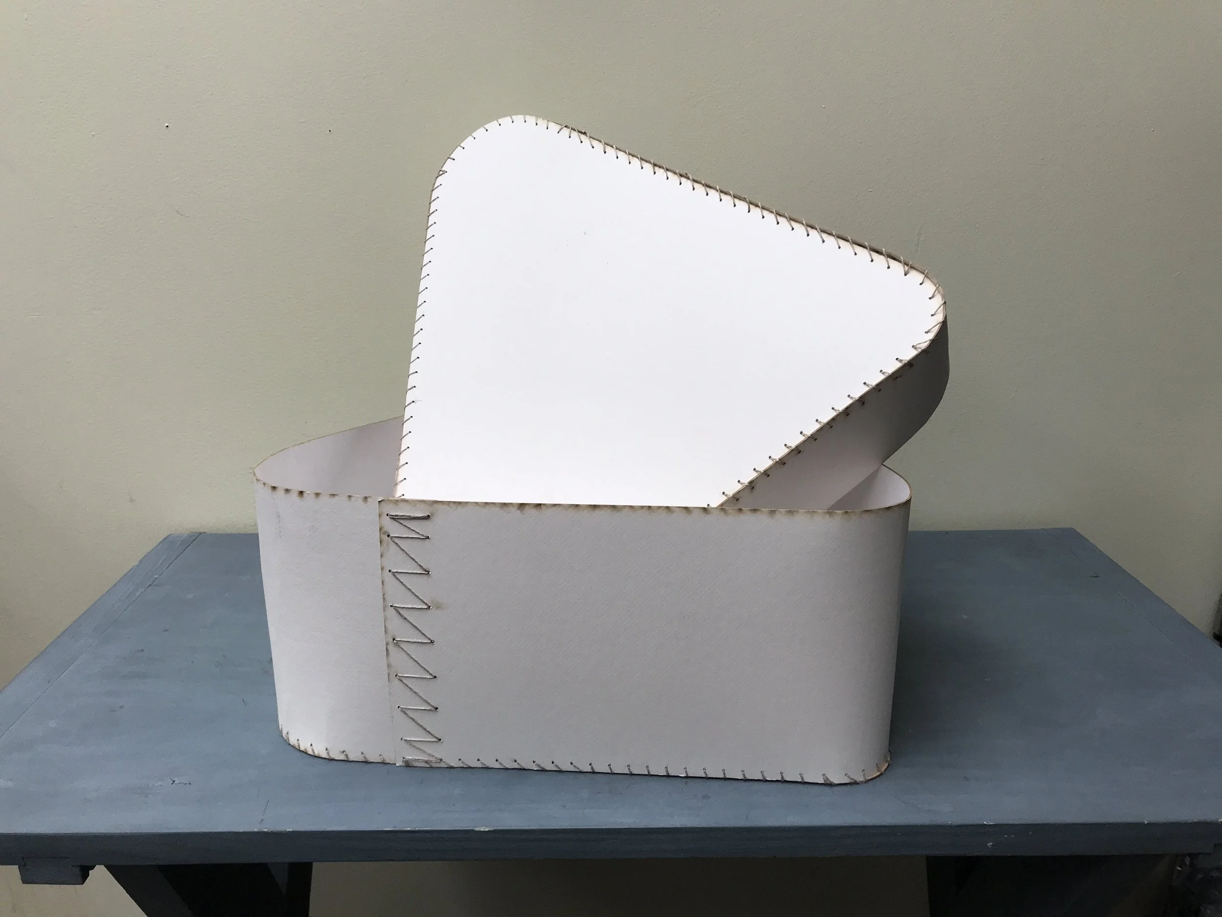 The top, slightly smaller bottom, and bands for each are cut from pulpboard and holes for assembly made around the perimeters of all.