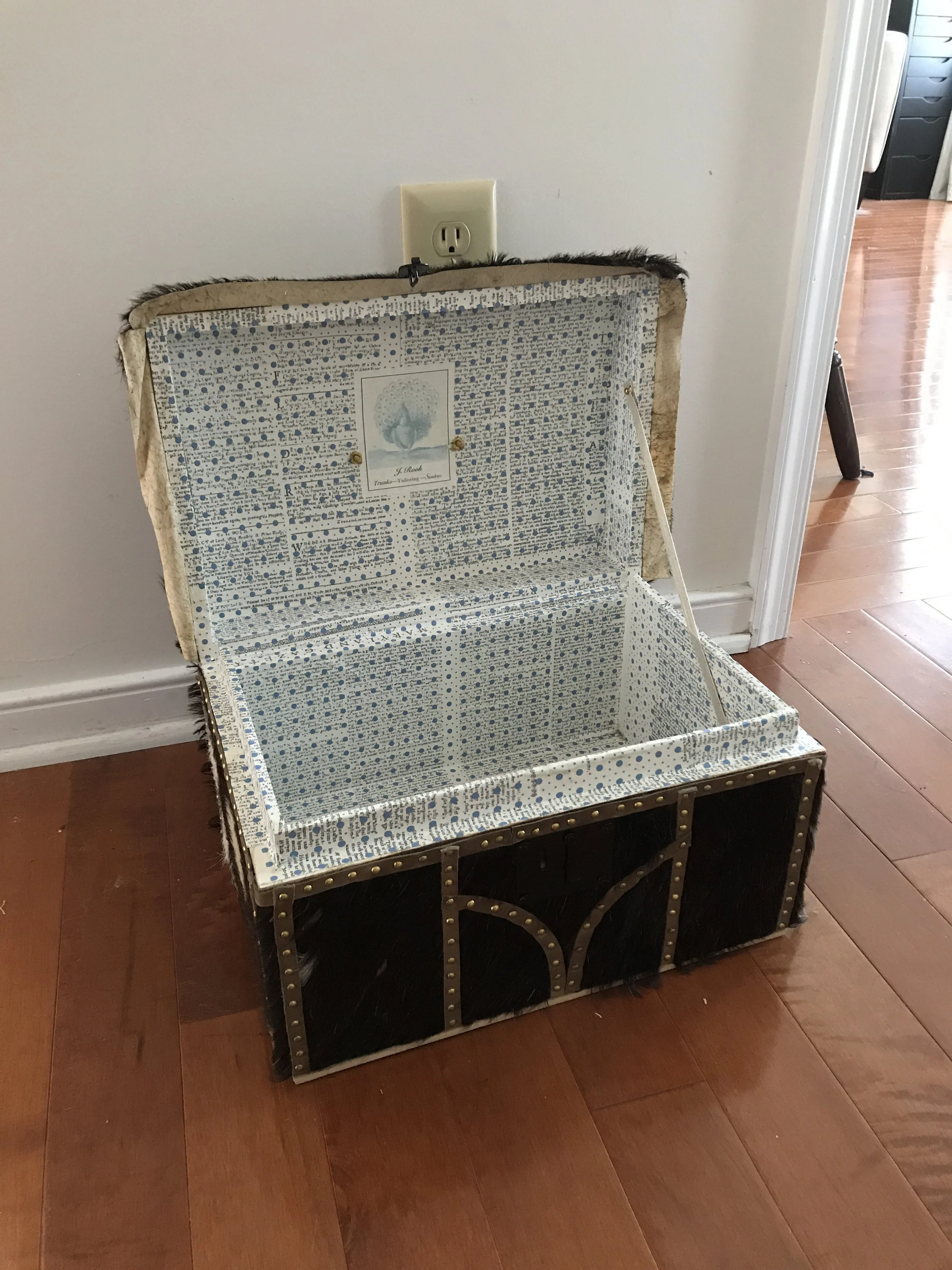 People who couldn’t or didn’t want to afford leather trunks could make the next less expensive choice - hide. Hide trunks, especially with the hair still on them, were actually less vulnerable to weather and travel conditions than leather ones. They usually had the owner’s initials on them in tacks, for identification purposes when using public conveyance.