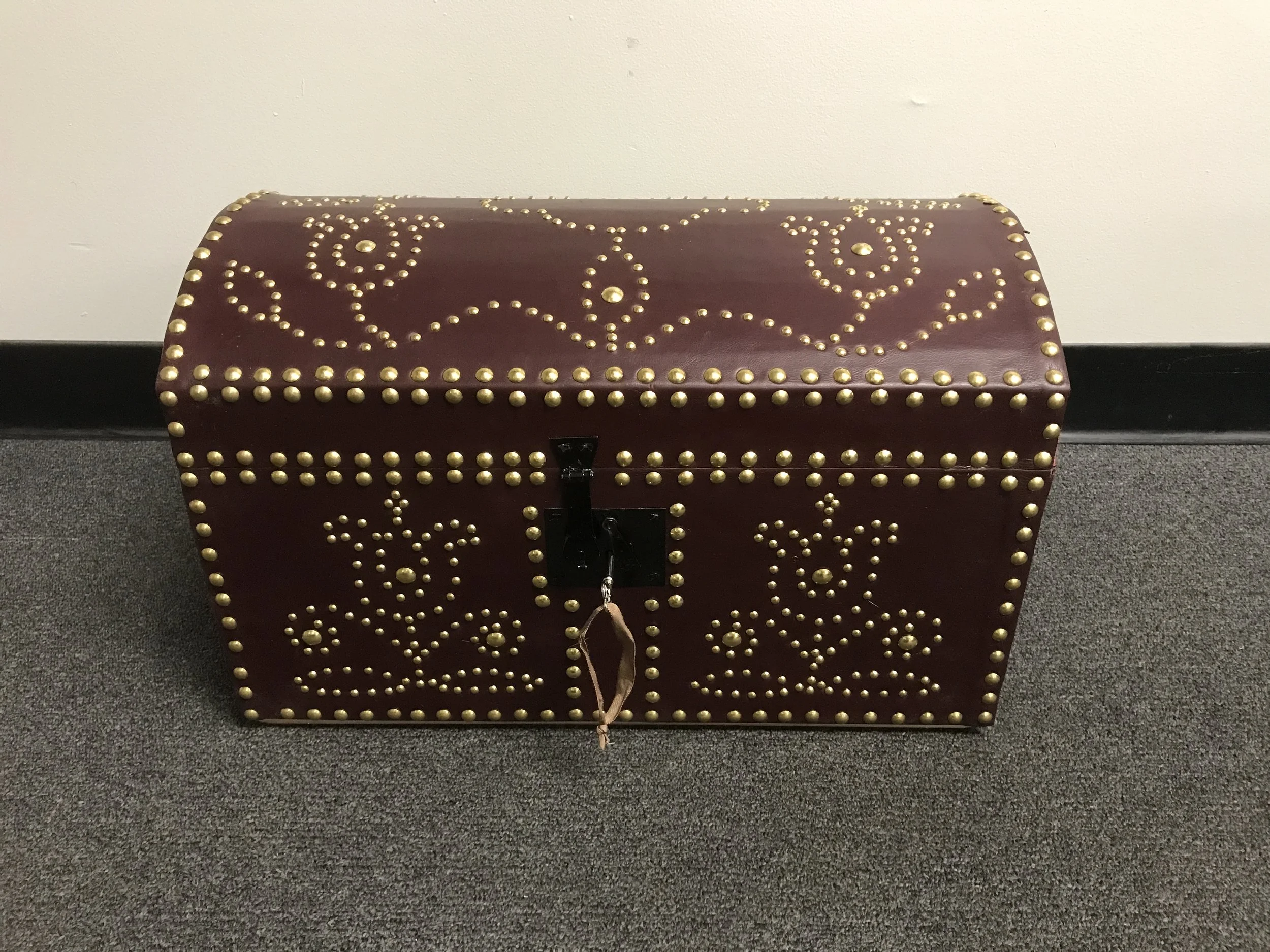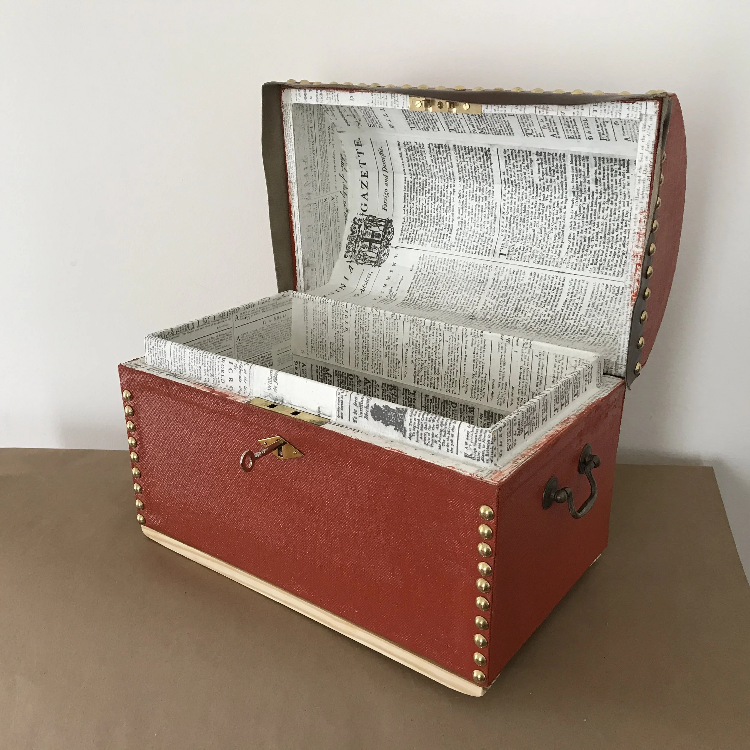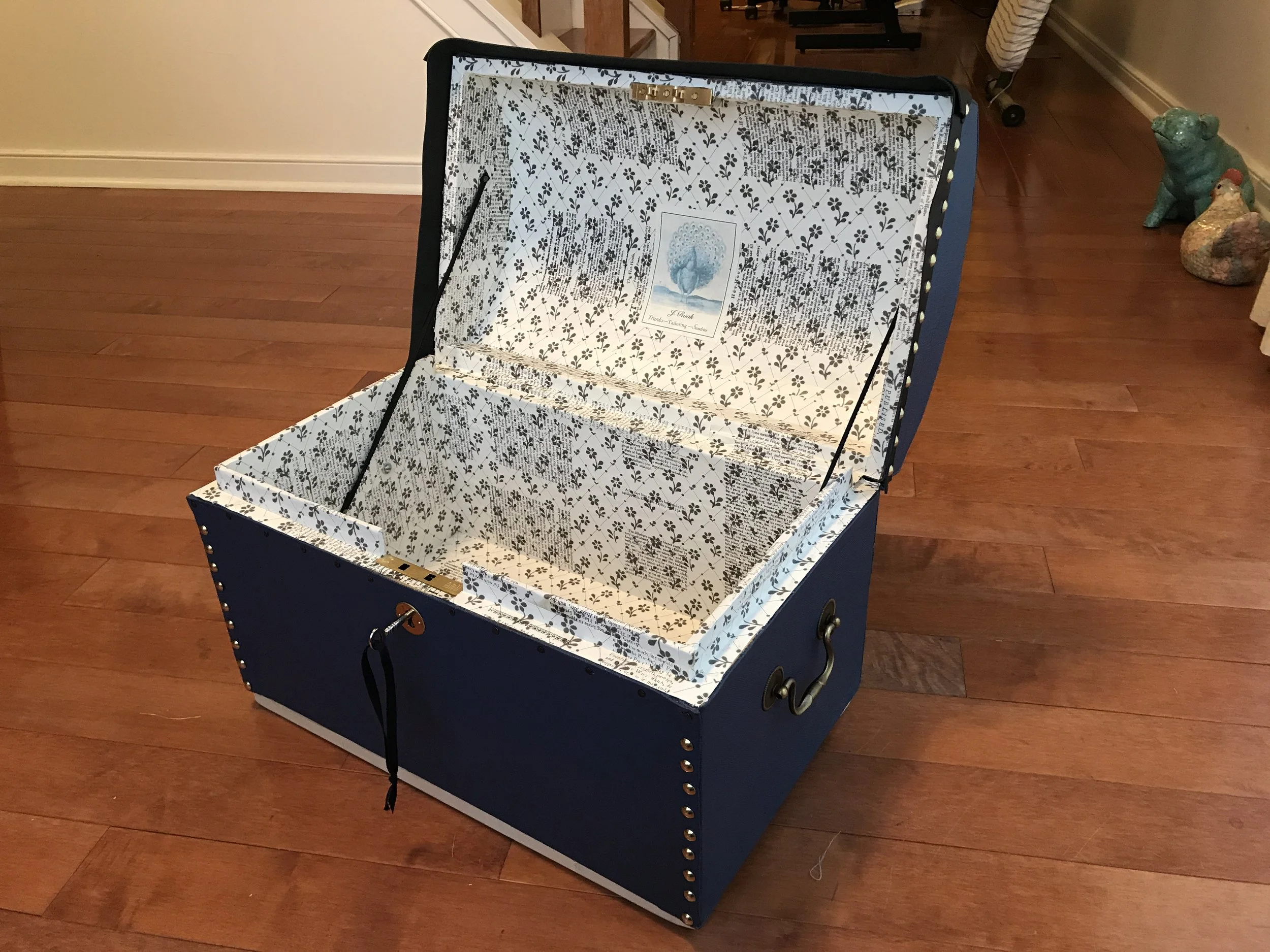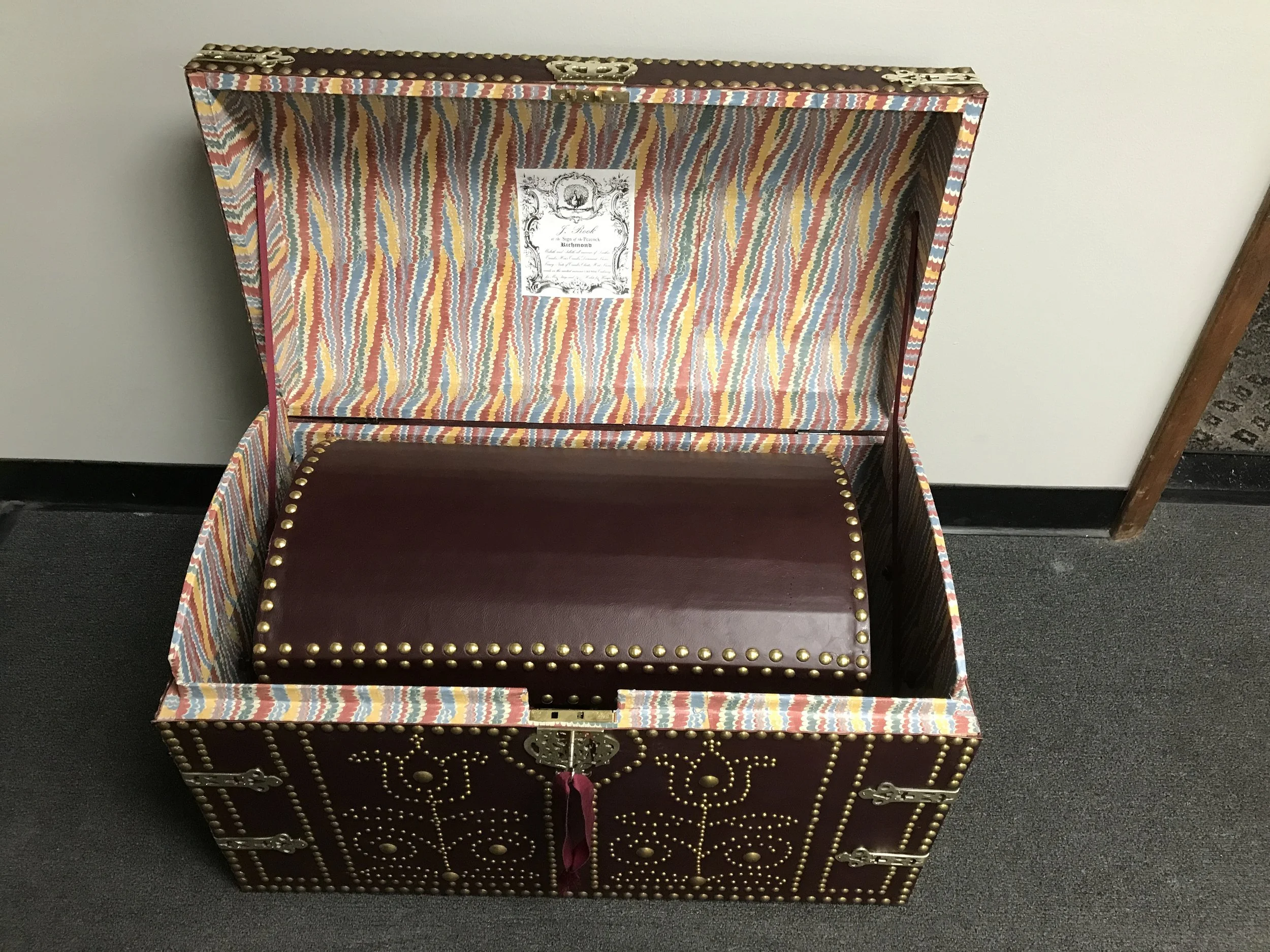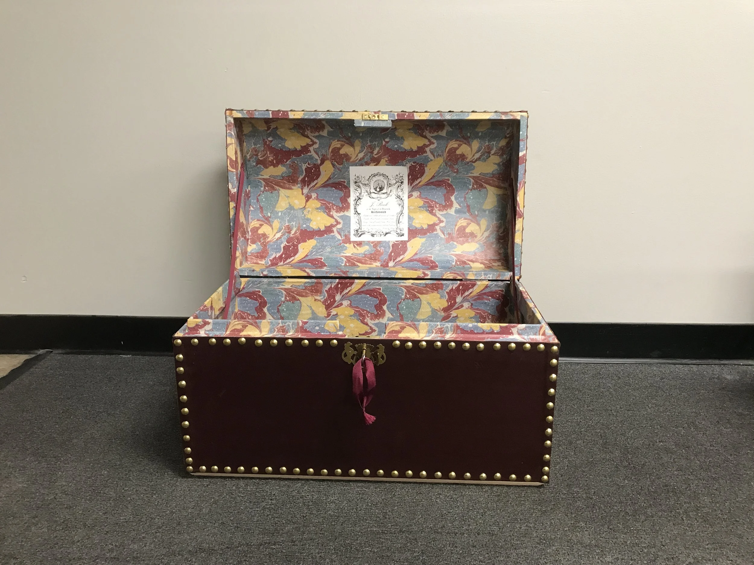 Such trunks would be covered with costly and beautiful coverings and fittings, both inside and out. Leather was a common choice for exterior covering, and might be extensively ornamented with metal fittings. Interiors could be marbled paper, printed fabric, specially printed paper, or overprinted paper intended for linings of furniture.